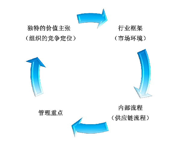 供應(yīng)鏈戰(zhàn)略是從企業(yè)戰(zhàn)略的高度來(lái)對(duì)供應(yīng)鏈進(jìn)行全局性規(guī)劃,它確定原材料的獲取和運(yùn)輸、產(chǎn)品的制造或服務(wù)的提供、產(chǎn)品配送和售后服務(wù)的方式與特點(diǎn)。一般情況下,組織的供應(yīng)鏈戰(zhàn)略是由四個(gè)要素之間的相互關(guān)系決定的,即行業(yè)框架(市場(chǎng)環(huán)境);獨(dú)特價(jià)值主張(組織的競(jìng)爭(zhēng)地位)、管理重點(diǎn)(供應(yīng)鏈流程與業(yè)務(wù)戰(zhàn)略之間的聯(lián)系)以及內(nèi)部流程(供應(yīng)鏈流程)。